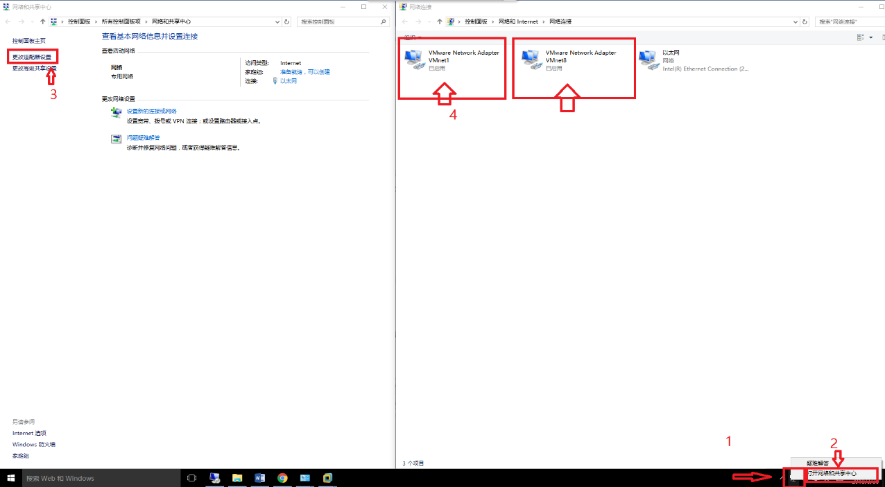 右键网络图标,选择网线与共享中心,点左侧的更改适配器设置,在适配器设置中启用VMware虚拟网卡。