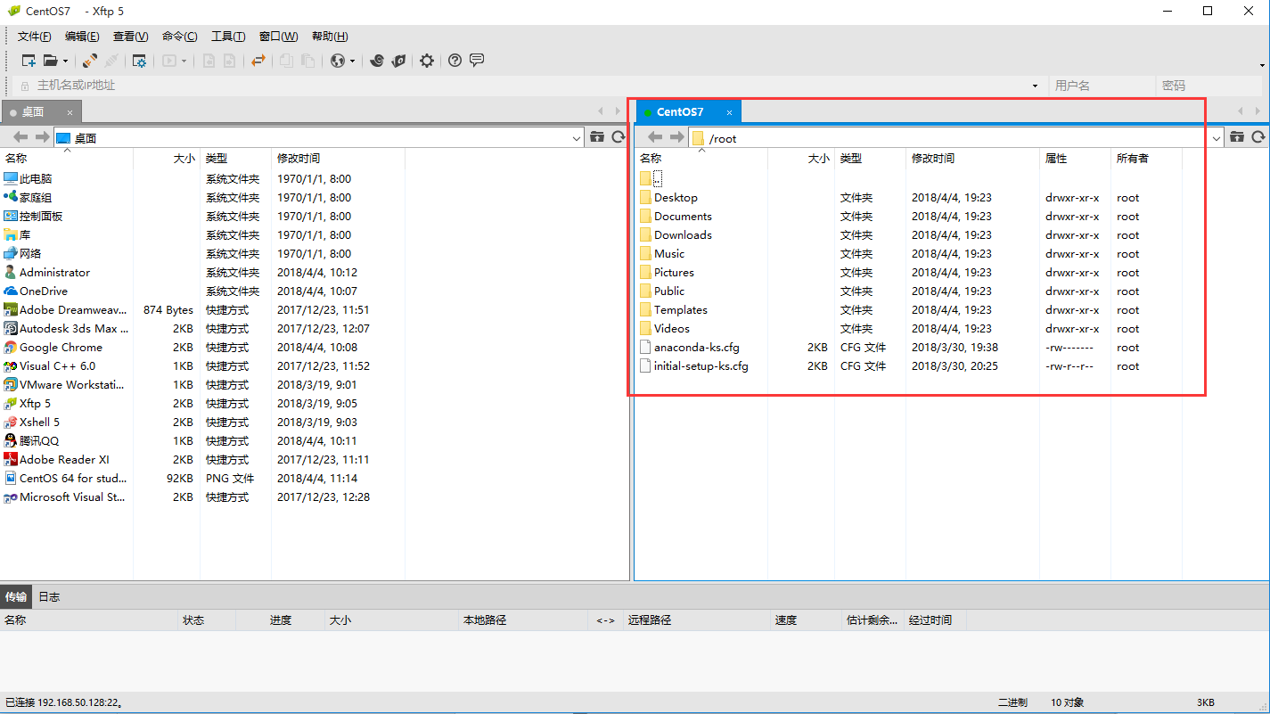 连接成功如下图所示,左侧是Windows的系统文件、右侧是linux的系统文件
