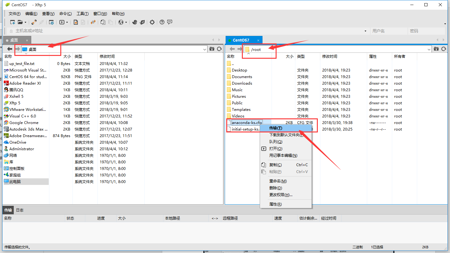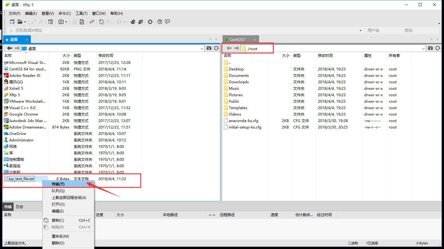 上传文件的演示:在左侧选择要传输的windows的文件,右键选择传输,就可以通过XFTP上传文件到右侧上方的/root目录
