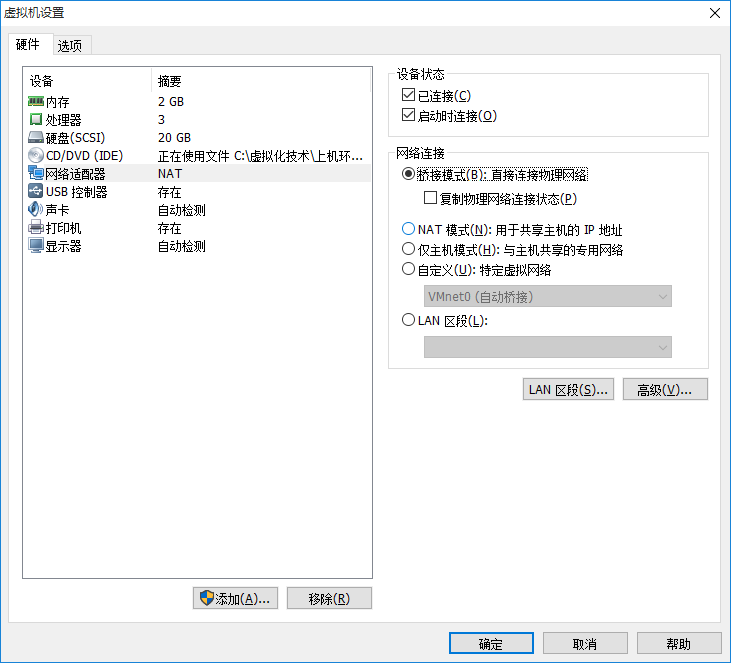 - 设置虚拟机网卡模式,将网卡模式设置为桥接模式。